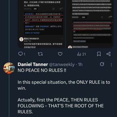 btw, somehow a line below suddenly comes out from my head after I posted my new tweets on X.com today, that "Every War Would Build Some New Rules(cancel some old rules) While It Comes End." or "Every New Peace Could Bring Some New Rules(cancel some old rules) While It Renews A Start."
