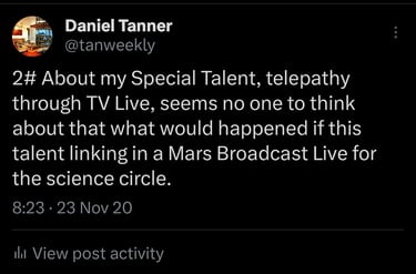 I have lots of Labels from varied angles or reasons. Of which one as "Victim Of Mind Read/Attack", frankly I don't like it. But I would feel a little prideful in private to stick a label as "Telepathy Through TV/Radio Live". And I posted several times on my former tweets. Pics showing below.
