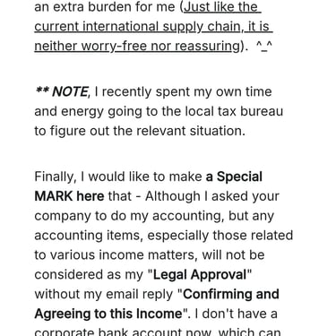 Finally, I would like to make a Special MARK here that - Although I asked your company to do my accounting, but any accounting items, especially those related to various income matters, will not be considered as my "Legal Approval" without my email reply "Confirming and Agreeing to this Income". I don't have a corporate bank account now, which can be said to be unable to operate normally.