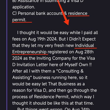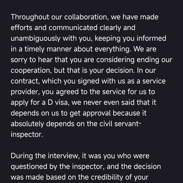 ** NOTE, the agent took my money but did not guarantee me. Even The Invitation Letter for the First D Visa application was issued and guaranteed by my newly established company legal person, I Inviting Myself. This can easily lead to visa rejection due to insufficient guarantor qualifications. I don't know if the original "Invitation letter" is still used to help me apply for a Second D Visa. (If it is still the original "Invitation letter", it means that they are using my own "special case" to test the bottom line of the review authorities again and again. Of course, that is a bigger "Thing" for them. Let me go back to my personal matter of the issue "paying money and getting corresponding returns")