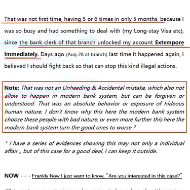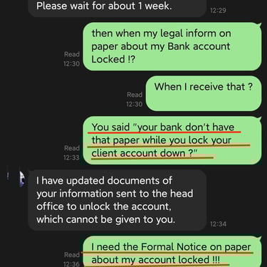 "Why your legal bank (branch) locked my account without a notice in advance (of bank app, sms or registered email etc), even now still CAN'T give me a Formal Legal Paper/Notice while I asking for insistently in person ?!"